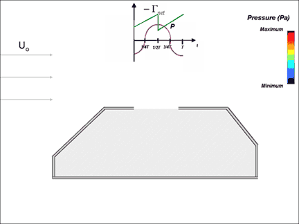 The animation below shows, in the middle, a side view of a car cabin with the sunroof open. As the air starts to flow at a certain mean velocity Uo, air mass will enter and leave the cabin as the pressure decreases and increases again. At the right hand side of the animation, a legend shows a range of colors to determine the pressure magnitude inside the car cabin. At the top of the animation, a plot of circulation and acoustic cavity pressure versus time for one period of oscillation is shown. The symbol x moving along the acoustic cavity pressure plot is synchronized with pressure fluctuations inside the car cabin and with the legend on the right. For example, whenever the x symbol is located at the point where t=0 (when the acoustic cavity pressure is minimum) the color of the car cabin will match that of the minimum pressure in the legend (blue).