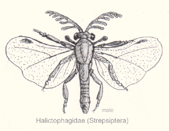 Description: The Strepsiptera (known in older literature as twisted-winged parasites) are an order of parasitic insects with nine families making up about 600 species. Their hosts include bees, wasps, leafhoppers, silverfish, and cockroaches.