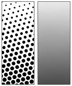 Half-tone : this simulates a continuous shade of an image by using equally spaced dots of different sizes. See the Wikipedia article on Halftone
