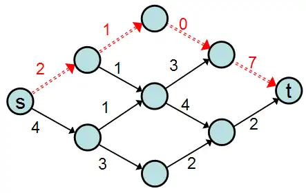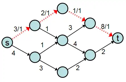- This allows finding a reverse path from the target node once reached, to the start node. Once a path is found, the edges are examined to find the edge with the minimum remaining capacity, and this becomes the flow that will result along this path , and this quantity is removed from the remaining capacity of each edge along the path. At the "bottleneck" edge with the minimum remaining capacity, no more flow will be possible, in the forward direction, but still possible in the backward direction.