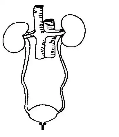 1. Add the following labels to the diagram of the excretory system shown below. Bladder | ureter | urethra | kidney | dorsal aorta | vena cava | renal artery | vein