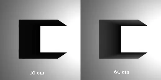 This is a Top view of a Box that is positioned just below and to the left of the light source. Notice that the shadow on the 60 cm Width Light appears to have a gradient on it unlike the nearly solid black shadow of the 10 cm Width Light. To get rid of the gradients, turn up the ray casts, and turn on multipass.
