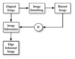 - Unsharp Masking is a technique which can also be used for image enhancement. Here a blurred version of the image is subtracted from the original using a weighting factor, W, which can control the degree of edge enhancement - see Figure 5.12. The edge enhancement effect is similar to that achieved using spatial or Fourier filtration, as can be seen in Figure 5.13.