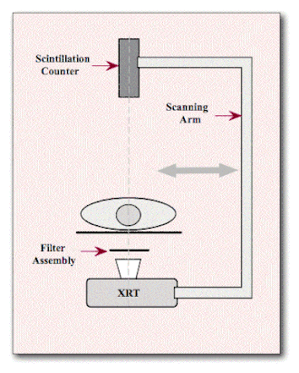 The DEXA technique typically involves an X-ray tube and scintillation detector mounted on a C-arm (see the figure below) so that the patient is exposed to a pencil X-ray beam scanning in a rectilinear fashion.