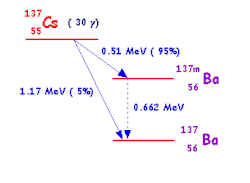 This isotope can decay through through two beta-minus processes. In one which occurs in 5% of disintegrations a beta-minus particle is emitted with an energy of 1.17 MeV to produce barium-137. In the second which occurs more frequently (in the remaining 95% of disintegrations) a beta-minus particle of energy 0.51 MeV is emitted to produce barium-137m – in other words a barium-137 nucleus in a metastable state. The barium-137m then decays via isomeric transition with the emission of a gamma-ray of energy 0.662 MeV.
