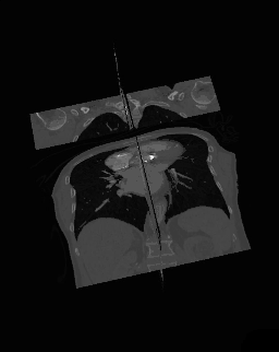 We've described the maximum intensity projection (MIP) earlier in the context of axial projection, where the maximum voxel value is determined for lines running in parallel through the projected slice thickness. A sequence of such images can be generated when this computation is applied at successive angles around the voxel data. One simple sequence is a rotating one for 360 degrees around the horizontal plane, as illustrated in the left panel of the figure below, where the maximum intensity is projected for every 9 degrees around the patient and the resultant 40 images compiled into a repeating, temporal (e.g. movie) sequence: