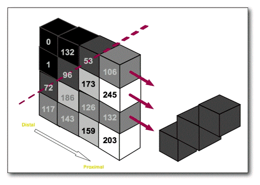 The first two images in the second row show the result of what are called a Maximum Intensity Projection (MIP) and a Minimum Intensity Projection (MinIP), respectively. A MIP evaluates each voxel along each line of voxels through the volume to determine the maximum voxel value and forms an image using the values so determined for each line. A MinIP uses the minimum voxel values, as illustrated in the following figure: