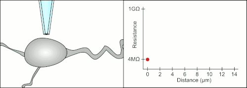 This patch pipette is pressed against a cell's surface and gentle suction is applied through the microelectrode to draw a piece of the cell membrane (the 'patch') inside its tip. The suction causes the pipette to form a tight seal with the cell's membrane with an electrical resistance of several gigaohms. This configuration is the "cell-attached" mode, and it is useful for studying the activity of the ion channels in the patch of membrane.