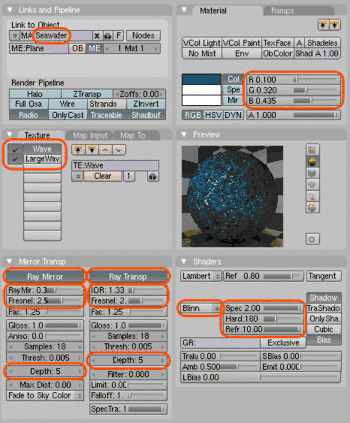 Now, on the same tab, give the seawater material a color of RGB (0.100, 0.310, 0.435). Find the tab that reads 'Mirror Transp' and click it. Click on 'Ray Mirror' and 'Ray Transp'. For the "Ray Mirror" box, move the 'RayMir' slider to 0.3, the 'Fresnel' slider to 2.5 and the Depth to 5. For the 'Ray Transp' box, move the 'IOR' slider to 1.33, the 'Fresnel' slider to 2.0 and the Depth to 5. This will give the water realistic transparency and reflection. Also click the 'Shaders' tab, change 'CookTorr' to 'Blinn', move 'Spec' to 2.000, 'Hard' to 180 and 'Refr' to 10.000. This will make the water look more glossy.
