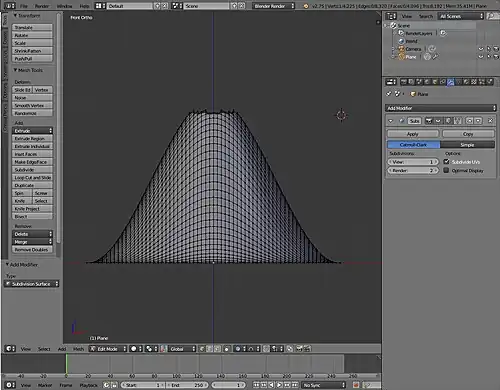 In top view, select one of the points in the middle of the plane. With this point selected change to side view. Press the O , which enables the "Proportional Edit Falloff" tool in the Menu-Panel beneath the 3-D-Window. As seen in the previous tutorial Blender 3D: Noob to Pro/Mountains Out Of Molehills when you move a vertex while edit falloff is enabled, all vertices in a defined radius of the selected vertex will align with the selected vertex when its position is altered. How they are adjusted can be chosen in the tab on the right of the yellow dot. I propose using "smooth falloff".
