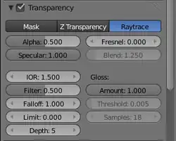 context in the Properties window. Find the Transparency panel, and check the box at the top to enable transparency. In the row of buttons for selecting the type of transparency just below that checkbox, titled “Mask”, “Z Transparency” and “Raytrace”, select “Raytrace”.