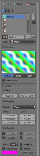 (the leftmost of the 3 buttons at the top of the topmost panel) is selected. Create a new texture, and change its type to “Magic”, which has a nice variety of different colours. Go to the Influence panel; by default the top-left checkbox (affect background progression) is checked; but this does nothing, because the default sky setting is not to have a progression at all. So uncheck that box, and check the second one on the left (affect horizon colour) instead.