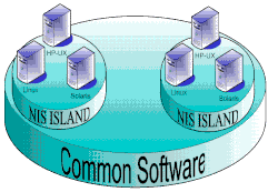 In an IT organization which administrate all kind of computer systems, following abstracted diagram shows the systems are segregated into varied sub-systems islands by NIS name services. Each NIS islands has its own set of accounts, netgroups and varied same software.