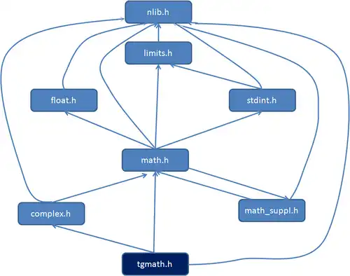 The flowchart below shows the Dependency graph for tgmath.h.[4]