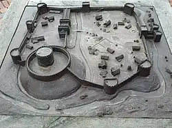 A model of Bedford castle. The distinctive motte with tower can be seen at the bottom left.