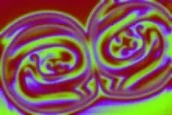 There are two figures showing the system at times 0, 640, 2600. At a certain point in time and space the species distribution becomes chaotic. The chaotic part shows a fast growth.