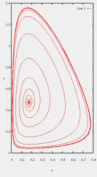 than there is a stable limit cycle surrounding the steady state. There is a figure of such a cycle where the path begins near from the stationary point and the parameters are , and .