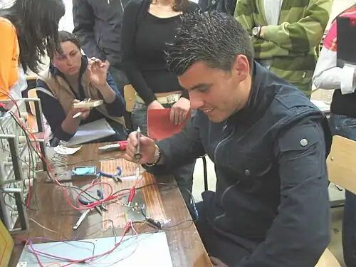 The picture above shows how we have built a transistor switch. It was very interesting task for us. Some of my colleagues took part in this. I watched them with extreme attention. First, the lecturer found a prototyping printed circuit board (PCB), which he gave to us. After that we started building up our "invention". We soldered the supply voltage to the PCB. Then we put n-p-n transistor on the board. It was very difficult to solder its pins... but we made it!