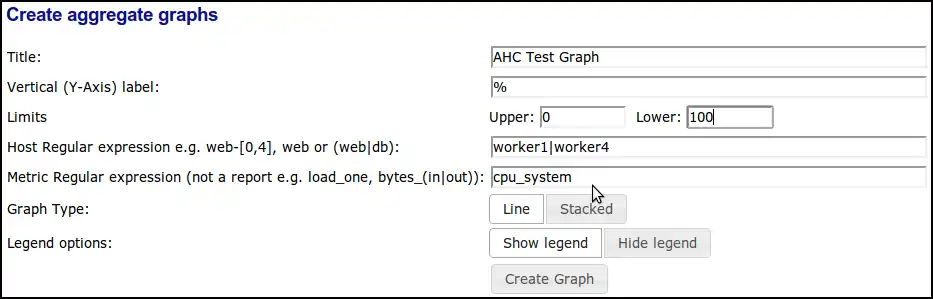 If that is not enough it is also possible to create entirely custom aggregated graphs where you can specify the used metrics, axis limits and labels, graph type (line or stacked) and nodes. In figure [fig:graph_aggregation] we specified such a graph. We choose a custom title, set the Y-axis label to percent, set the lower and upper axis limits to 0 and 100 and the system cpu utilization as a metric. It is also possible to choose more than one metric as long as the composition is meaningful.