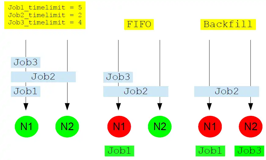 The backfill process is a kind of FIFO with efficient allocation. Once a job requires currently free resources and is queued behind other jobs, whose resource claims currently can not be satisfied, the “minor” job is preferred. The by the user defined time limit is relevant.