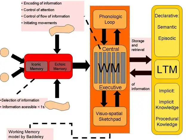 - ↑ Baddeley, A. D. & Hitch, G. (1974). Working memory. In G. A. Bower (Ed.), Recent advances in learning and motivation (Vol. 8).