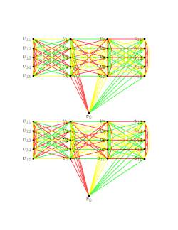 To see that R(3,3,3) ≥ 17, it suffices to draw an edge colouring on the complete graph on 16 vertices with 3 colours, which avoids monochromatic triangles. It turns out that there are exactly two such colourings on K16, the so-called untwisted and twisted colourings. Both colourings are shown in the figure to the right, with the untwisted colouring on the top, and the twisted colouring on the bottom. In both colourings in the figure, note that the vertices are labeled, and that the vertices v11 through v15 are drawn twice, on both the left and the right, in order to simplify the drawings.