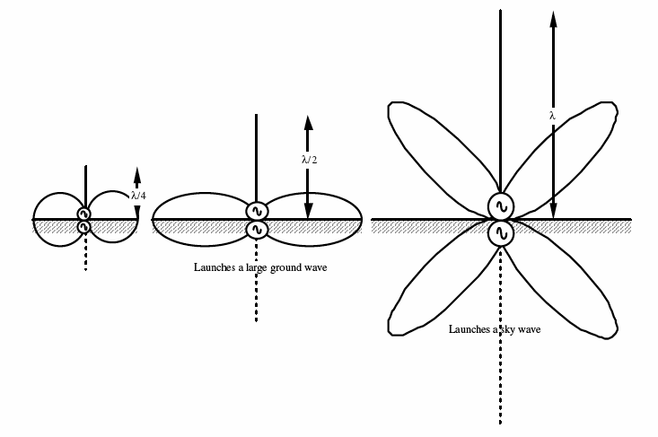 Notice that a Marconi antenna could be considered as a dipole antenna with one of the poles buried in the ground. The ground acts as a reflector to create the appearance of an buried antenna in the same way that a mirror creates the appearance of someone behind the glass. Increasing the antenna length has a significant impact on the radiation pattern: