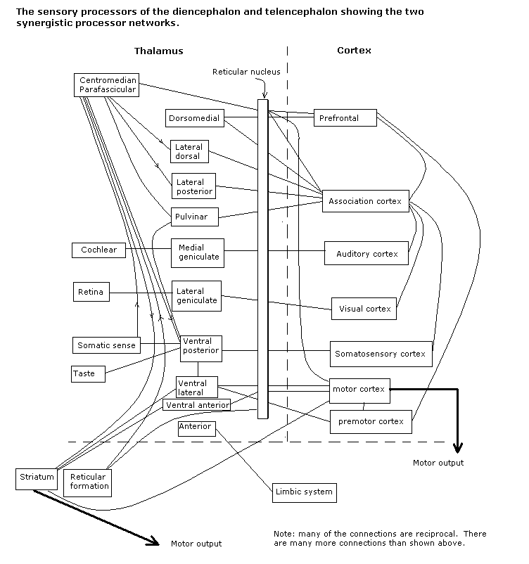 The thalamus is connected to the entire bottom layer of the cerebral cortex. It is the nexus of the various cortical processors as well as a recipient of independent input from most of the rest of the brain.