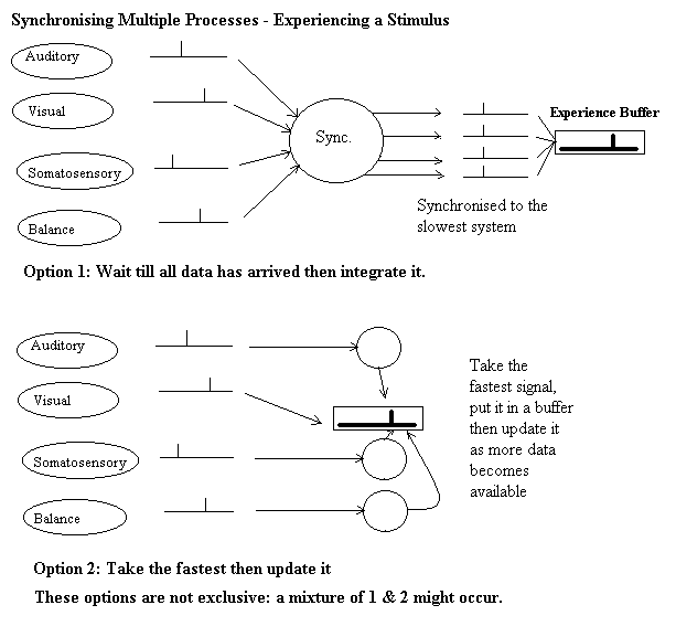 In the first option a complete model of sensation, dream etc. may be created and then allowed to become part of conscious experience. In the second model events are released into experience as fast as possible but are synchronous when recalled, having been synchronised in a storage buffer. There is a third option in which there is no synchronisation of events so that the output from different processors would occur at different times.