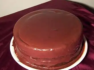 - Immediately 'frost' the cake with this, making sure that there is quite a bit between the two layers of cake. The cake will need to be refrigerated to harden the fudge, so don't worry about its relatively liquid nature.