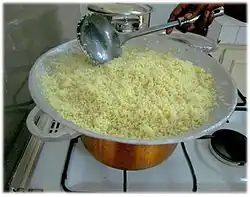 Couscous is a staple food and national dish in Algeria, originating with the original Berber population. It is technically a type of pasta, made of a semolina dough crumbled into small grains and cooked until fluffy. It's traditionally steamed in a taseksut (also called kaskas or couscoussier) and can be served savory or sweet.