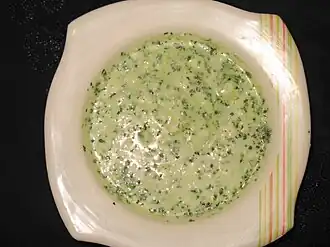 Raita is an Indian garnish often served with spiced dishes. It acts as a cooling flavour as the fat in the yogurt dissolves and mollifies chili in the curry, while the taste of cucumber and fresh mint or other herbs refreshes the palate.