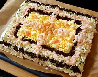 Smörgåstårta or sandwich cake is a typical Swedish party dish, not to be confused with Smörgåsbord. The sandwich cake is a very rich sandwich with so much filling it resembles a cake. It is excellent for receptions and parties since it is served cold and can be prepared in advance. It is also possible to have great variation in the fillings to accompany most peoples taste. The dish can be served as a cake or in smaller piece as appetizers.