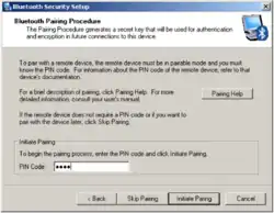 This action opens the security window. Here you have to choose four digits for securing the connection. Choose the same number as your e-puck (if your e-puck is called ”e-puck_0202”, choose 0202 as PIN) and click on the Initiate Paring button.