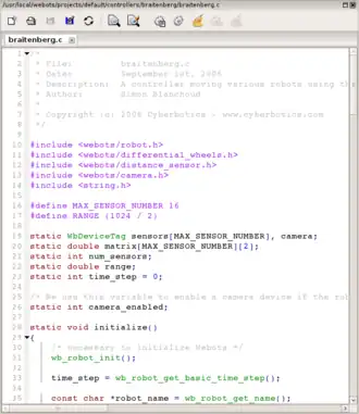 Until now, you have programmed the robot behavior by using BotStudio. This tool enables to program quickly and intuitively simple behaviors. Probably you also remarked the limitations of this tool in particular that the expression freedom is limited and that some complex programs become quickly unreadable. For this reason, a more powerful programming tool is needed: the C programming language. This programming language has an important expression freedom. With it and the Webots libraries, you can program the robot controller by writing programs. The problem is that you have to know its syntax. Learning the C language is out of the focus of the present document. For this reason, please refer to a book about the C programming. There are also very useful tutorials on the web about this subject like those wikibooks on C programming