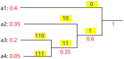 - Create a new internal node with these two nodes as children and with probability equal to the sum of the two nodes' probabilities.