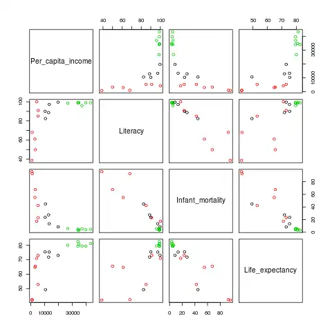 | Country | Per capita income | Literacy | Infant mortality | Life expectancy |