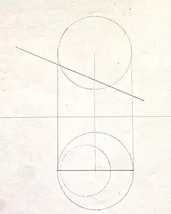 1. Think of the given line in one view to be the edge view of a section of the given solid. 2. The points where the line crosses the base of the cylinder in this view are the piercing points. 3. Find the piercing points in the other view by projecting these points down until they cross the given line.