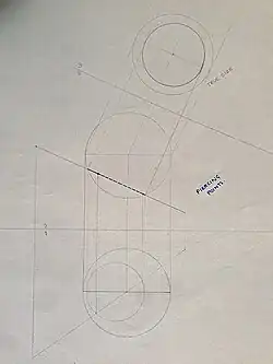 1. In top view, locate the apparent piercing points, where each side of the given plane crosses the base of the cylinder. 2. Project these piercing points to the front view and mark them where they meet the same side of the plane. 3. To find more points that make up the plane of intersection, use cutting planes and traces: a. Pick a point on the base in top view (should lie inside the given plane and along the base of the cylinder). b. Draw a line (represents the edge view of the cutting plane) that contains that point, across the given plane. c. Project the line and the piercing point down to the front view. The piercing point (in the front view) is located on that line. d. Connect these piercing points (in the front view), taking visibility into consideration, to find the plane of intersection.