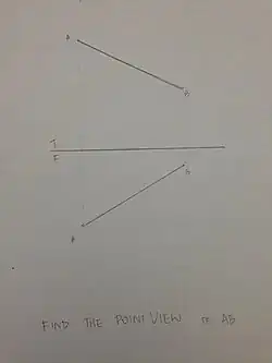 Point view of a line shows a view of a line in which its endpoints coincide. To find point view of a line you must first find it in true length if you have not already done so (the construction for finding true length of a line is described in the following section, True Length). Then you must take a view perpendicular to the true length line, and that will give you the line in point view.