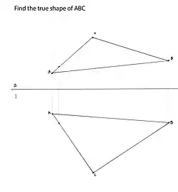 Finding the true length is a fundamental process in descriptive geometry that advances the problem-solving to the next steps to reach the solution. To find the true length of a line you must take a view parallel to the line; in other words, if a line is a parallel to the folding line in one view, it is shown in true length in the adjacent view. If a line is parallel to the folding line in both adjacent views, as for example in both the top and front views, then it is shown in true length in both of those views, and in such cases no additional work must be done if the only goal is to find the true length of the line.