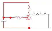 To further explain, the NOT gate has been integrated into a circuit by connecting it to a current probe and a battery. When the switch for the input of the not gate is not hit, the current flows in the path indicated by the red diagram below. The current flows through the resistor because the transistor does not conduct when the base is not saturated.: