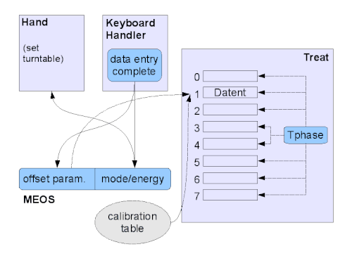 Another shared variable, MEOS, contains the mode and energy level specified by the operator. MEOS exists of 2 bytes: a low-order byte to set the turntable and a high-order byte, used by Datent, to set several operating parameters.
