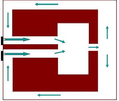 In microfluidic systems, a piezoelectric actuator can be used to impart an acoustic wave field in a liquid. This effect is even imparted through the walls of the device. The advantage is that the actuator does not need be in contact with the working fluid.[7] Since the streaming effect occurs normal to the resonator, there may be difficulties in coupling an actuator with typical micromachining techniques which generally yield 2-D layouts of microfluidic networks. The solutions developed for acoustic streaming assume that the acoustic wave is planar with respect to the channel axis. Therefore a configuration that results in the most predictable flow is one in which the acoustic wave source (piezoelectric bulk acoustic resonator) is placed such that the channel is axially oriented to the normal of the actuator surface.[8] Figure 6 shows such a configuration from a view looking down onto the device.