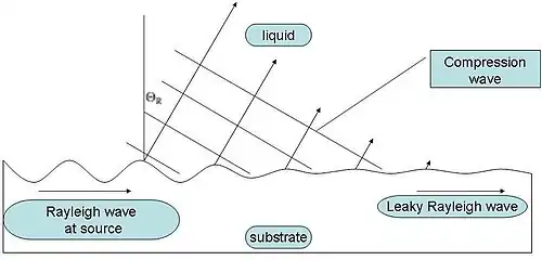 This is the case so long as the velocity of the SAW is greater than the acoustic velocity of the liquid. The compression wave radiating from the surface leaves at the Rayleigh angle given by: