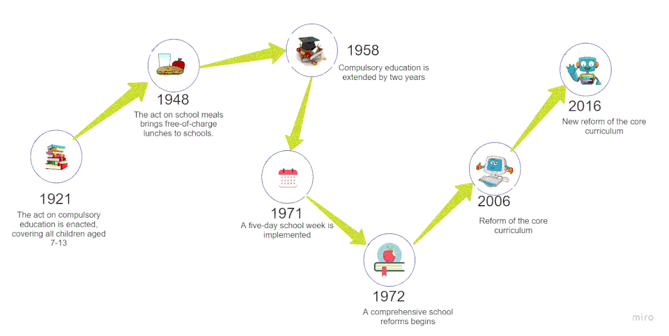 The 1970s saw a transformation of the education system, when the system of primary and secondary education was replaced by the comprehensive school system. It consisted of nine years of basic education provided by the state, adding three years of compulsory education. Now, the objective of the school reform was to ensure equity: equal, free basic education for all children regardless of where their families lived and what their families' socio-economic status was.