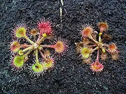 Spoon-leaved sundew, Spoonleaf sundew, Oblong-leaf sundew, Spatulate-leaved sundew Droséra intermédiaire, Rossolis intermédiaire, Rossolis à feuille longue |