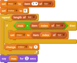 - set max (a variable) to the value of the first number in the list (store and retrieve values).