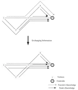On subsequent iterations, each traveler follows a fixed route chosen at the end of the previous iteration. Once arriving at a destination centroid, travelers will enrich the information set with their individual knowledge while benefiting from the pooled knowledge at the same time by exchanging both shortest path and toll information with centroids. Those travelers will also bring that updated information back to their origin and repeat the exchange process. The information exchange mechanism is illustrated by Figure 1.