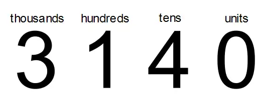 In denary if we want to use numbers bigger than 9 we have to start using multiple numerals. Each numeral is worth ten-times the numeral to its right. The number three-thousand, one-hundred and forty is shown in denary in figure 1 below.